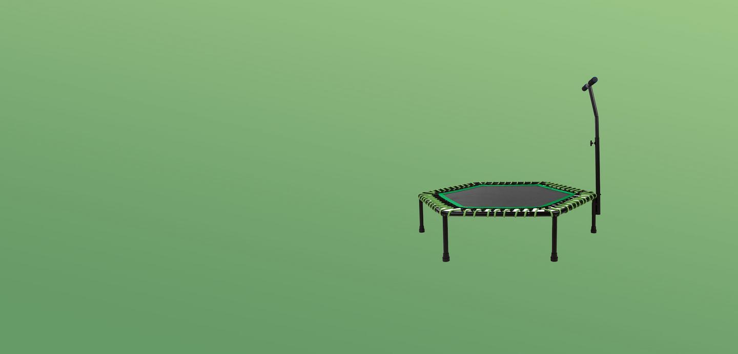 Die Sprünge werden durch eine Gummiseilfederung abgefedert – das schont die Gelenke. Das Sprungtuch und die höhenverstellbare Haltestange (bis 150 cm) sorgen für einen sicheren Stand. Das Mini-Trampolin lässt sich zu Hause nutzen, ohne Lärm zu machen.