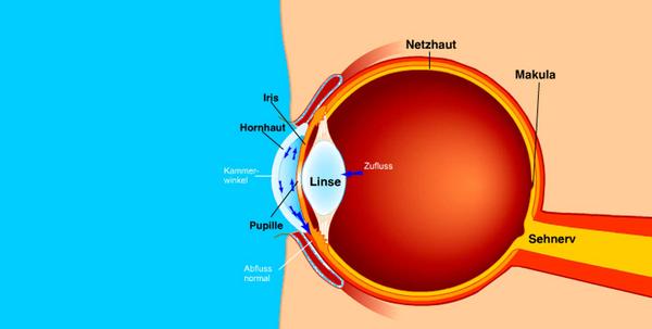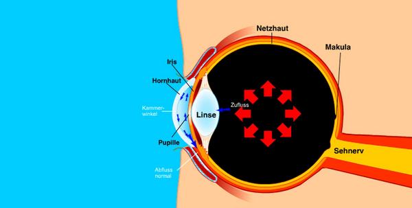 In den meisten Fällen haben Betroffene einen erhöhten Augeninnendruck. Für die Aufrechterhaltung des Augeninnendrucks ist das sogenannte Kammerwasser zuständig. Es versorgt das Auge außerdem mit Nährstoffen. Das Kammerwasser zirkuliert zwischen Hornhaut und Linse. Beim gesunden Auge kann es durch ein Kanalsystem im Kammerwinkel des Auges abfließen.
